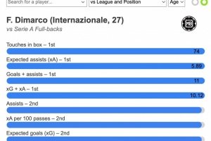 另外,迪马尔科助攻、每100次传球预期助攻、预期进球在意甲边卫球员中排名第二位。