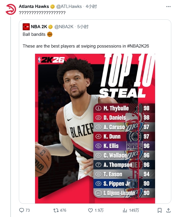 球队官推随后补充道:"场均3次抢断的表现理应让他成为第一,并且能力值达到99分才合理。"
